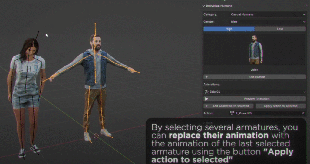 By selecting several armatures, you can replace their animation with the animation of the last selected armature using the button “Apply action to selected”.