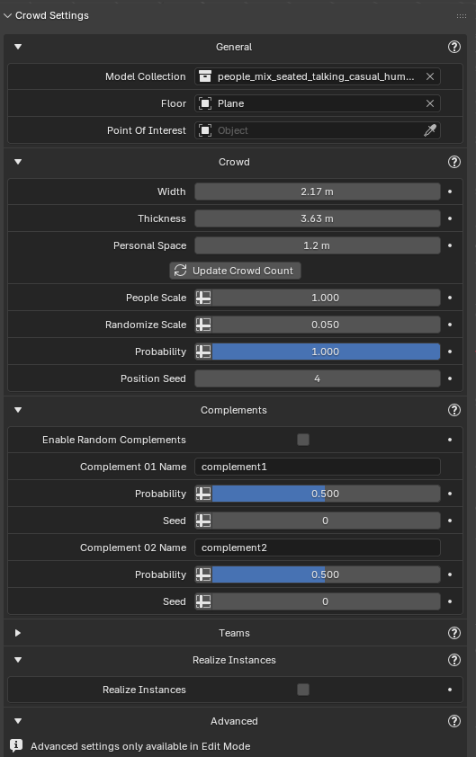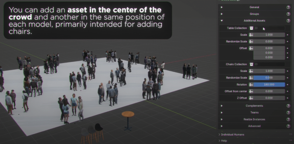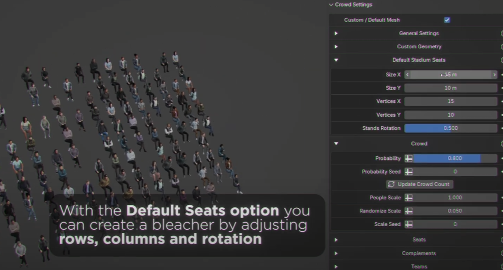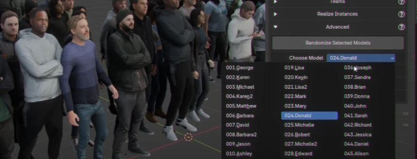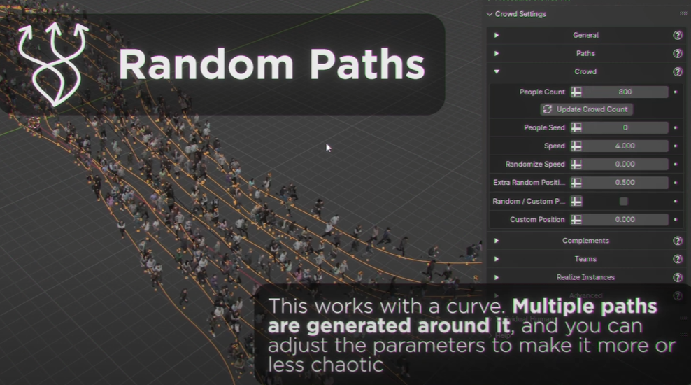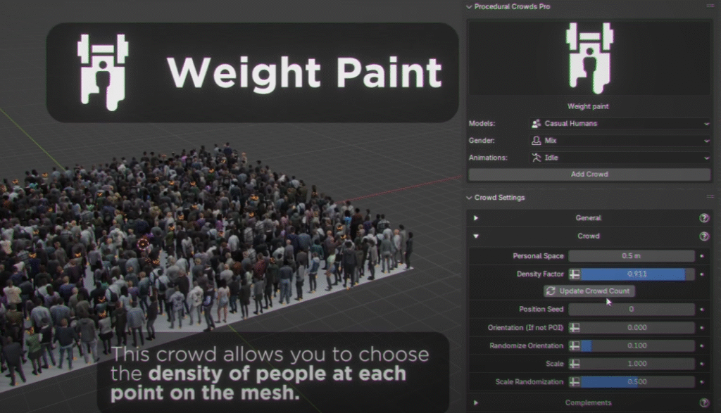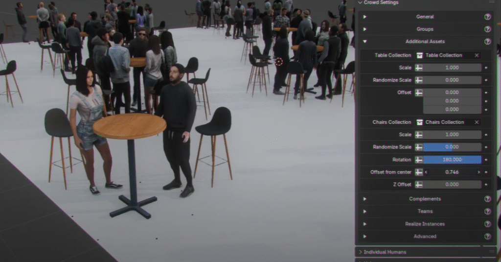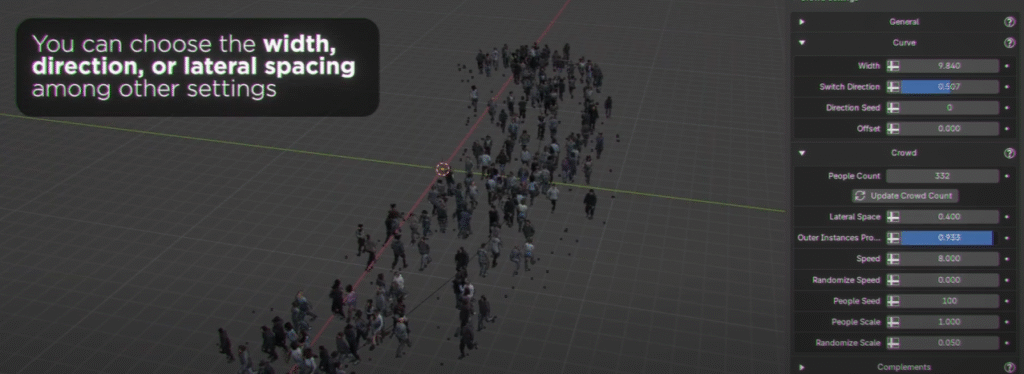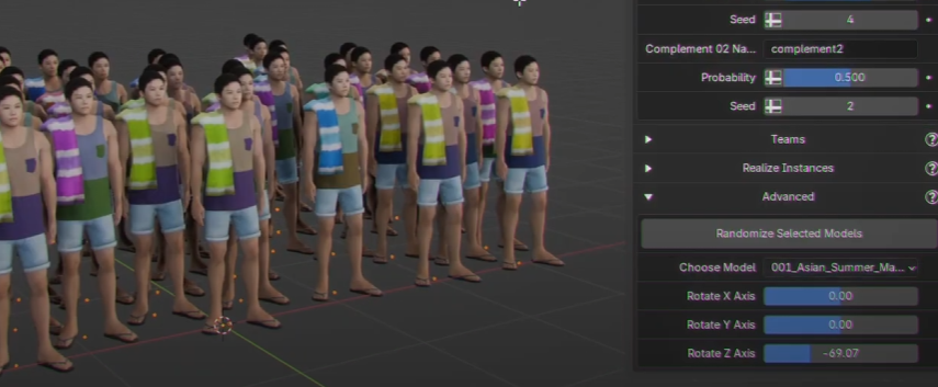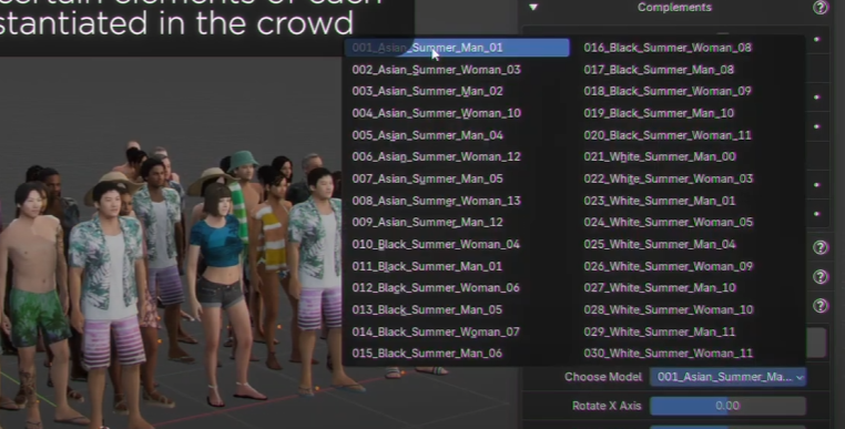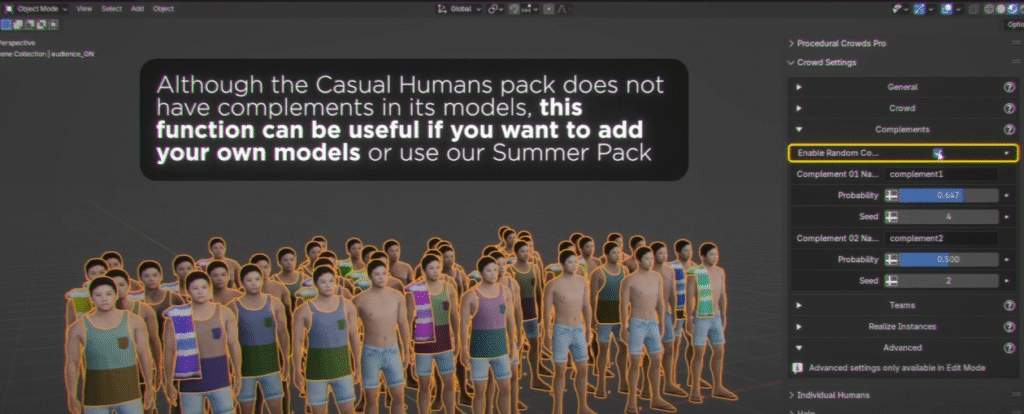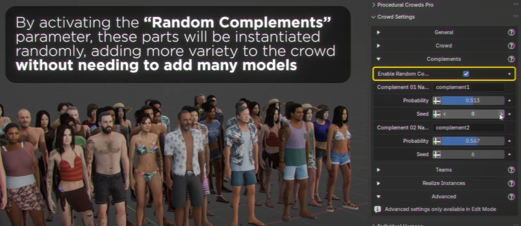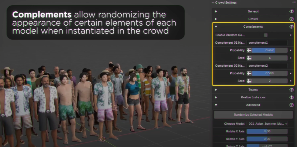 By activating the “Random Complements” parameter, these parts will be instantiated randomly, adding more variety to the crowd without needing to add many models.