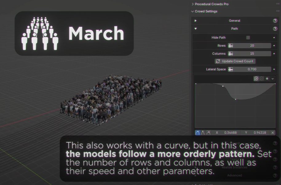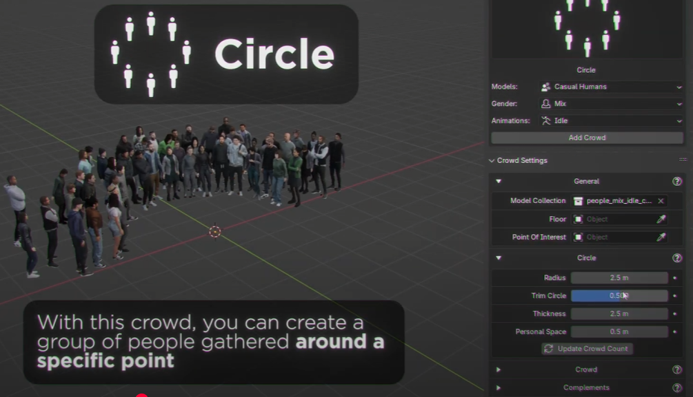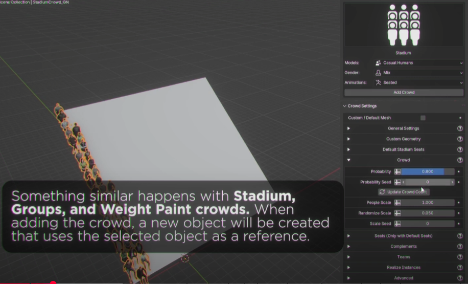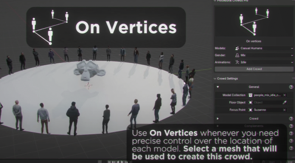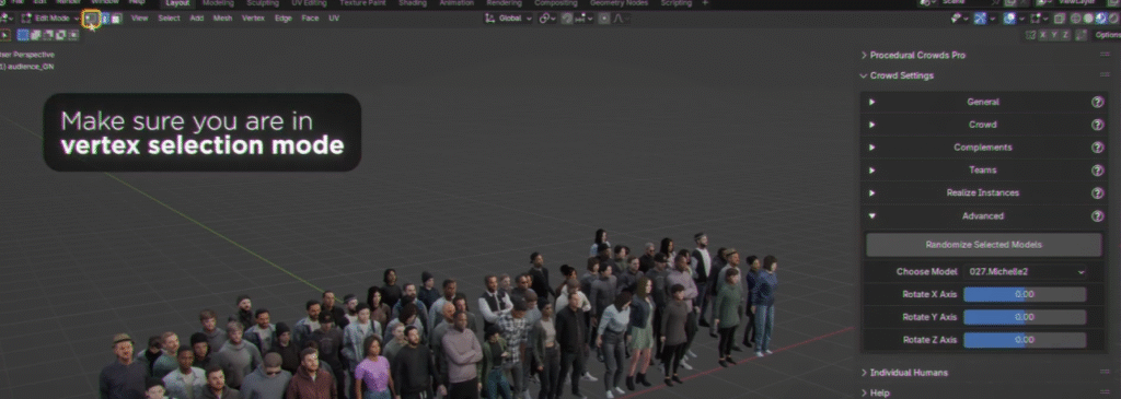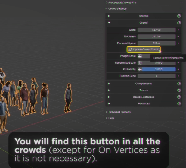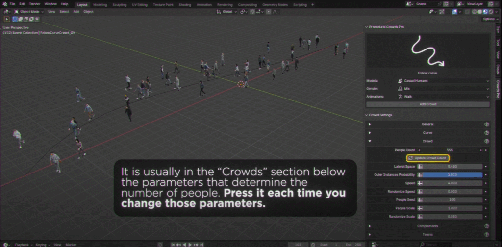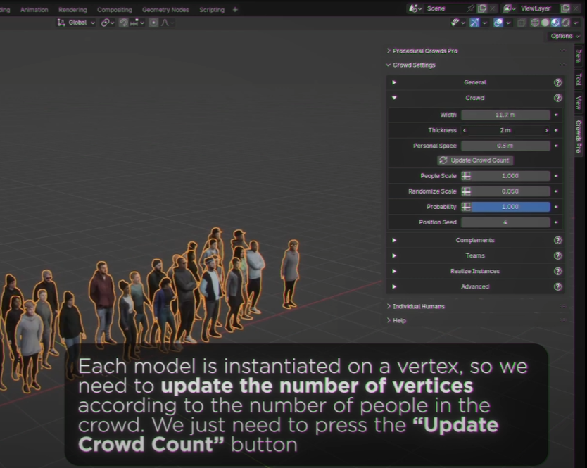 Each model is instantiated on a vertex, so we need to update the number of vertices according to the number of people in the crowd. We just need to press the “Update Crowd Count” button.