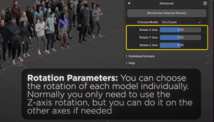 Rotation Parameters: You can choose the rotation of each model individually. Normally you only need to use the Z-axis rotation, but you can do it on the other axes if needed.