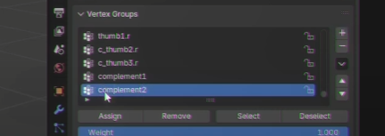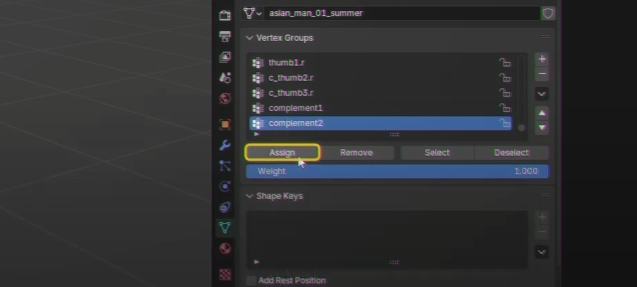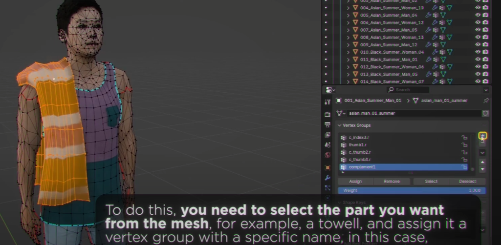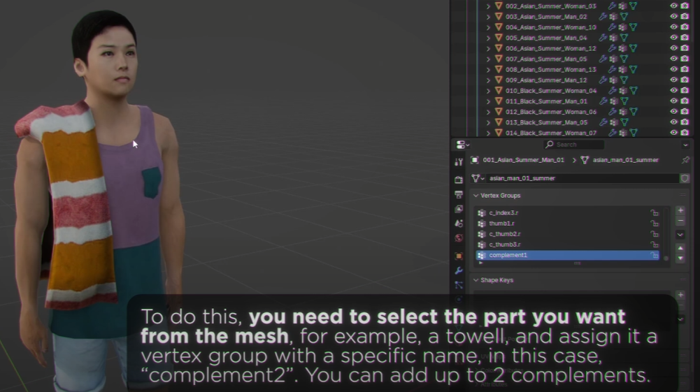To do this, you need to select the part you want from the mesh, for example, a towel, and assign it a vertex group with a specific name, in this case, “complement2”. You can add up to 2 complements.